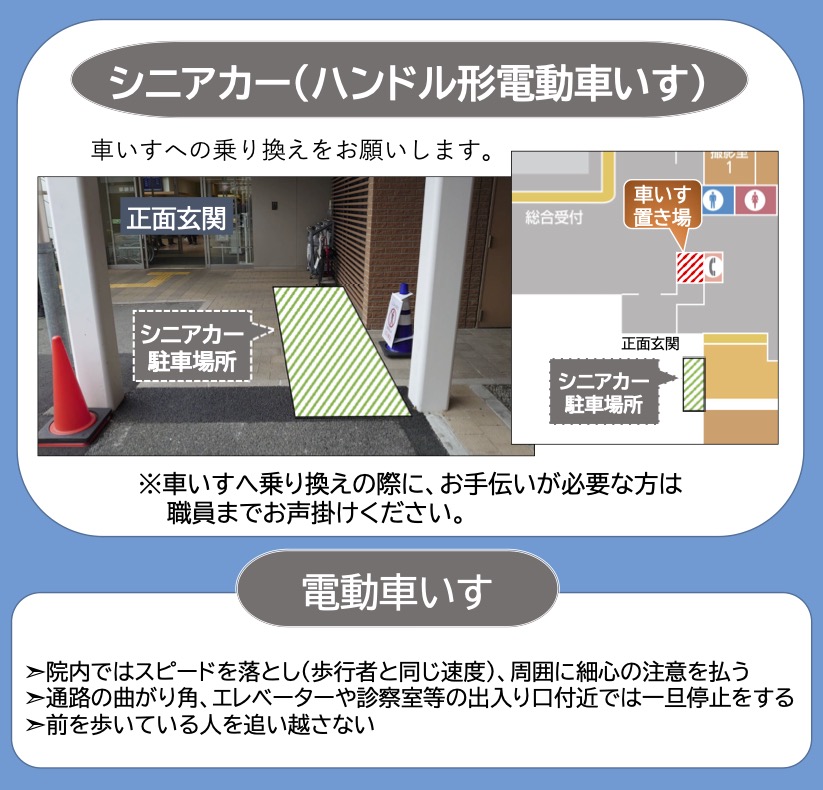 院内の通路幅および安全確保の観点から、シニアカー(ハンドル形電動車いす)での入館はご遠慮いただいております。 電動車いすでの入館は可能ですが、スピードを落とし、周囲に細心の注意を払ってください。